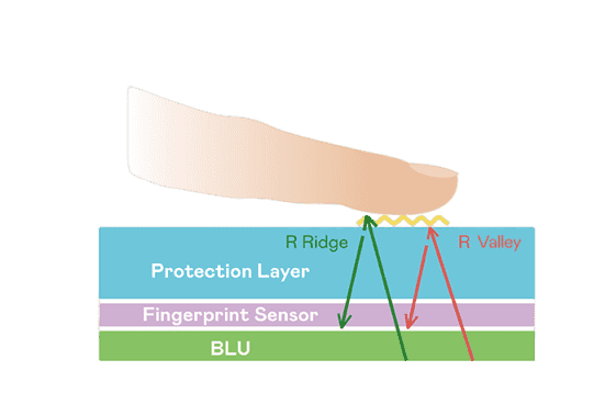 TFT 指纹扫描感测技术利用薄膜电晶体 (TFT) 当作光感测元件,,,,藉由非晶硅 (a-Si) 与低温多晶硅(LTPS)既有光电转换特性对不同波段光源进行吸收,,,使感测 IC 读取阵列感测元件的光漏电差异,,,,转换成数位灰阶影像。。